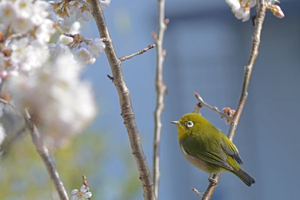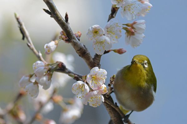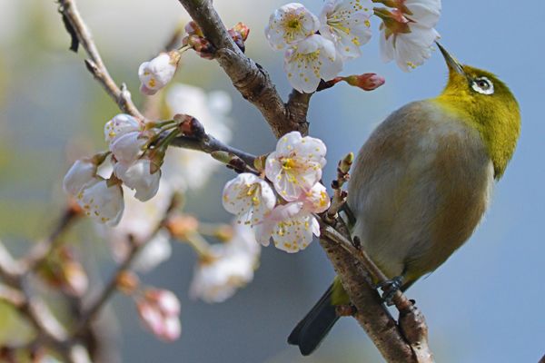 暖かかったので日向ぼっこ。友達のメジロ君がサクランボの木に遊びに来てくれ