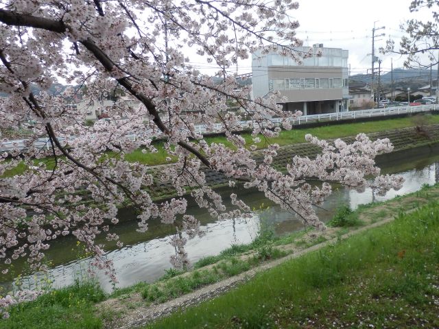 今日の竜田川 サクラ満開 雨はあがりましたが曇天です。