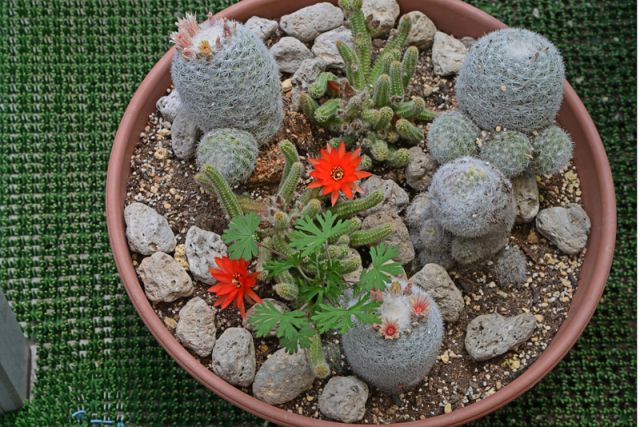 この春先サボテンを寄せ植えしミニサボテン公園を作りました。