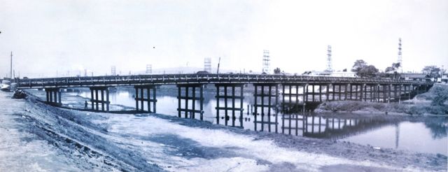 橋の周辺には高い建物が何もないですねー木造の橋の左端にミゼットらしき車が写っています。このミゼットいつもここに停まっていたような記憶があります。