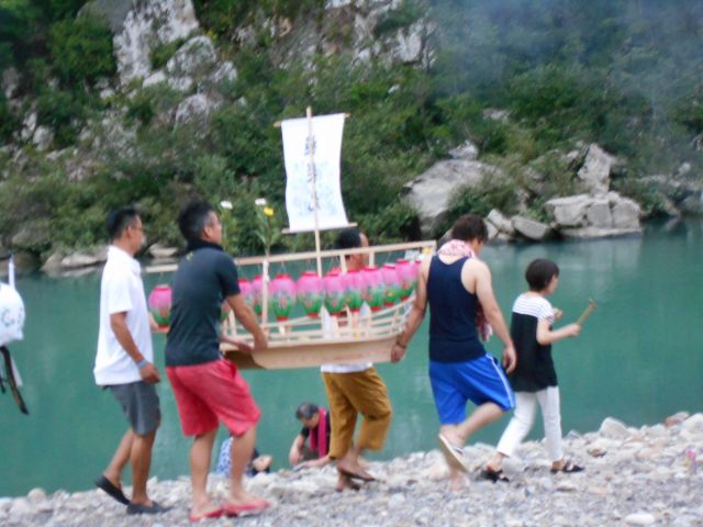 お盆の間、仏前に飾っていた灯篭、提灯、船(極楽丸)を日置川の河原まで運びます。