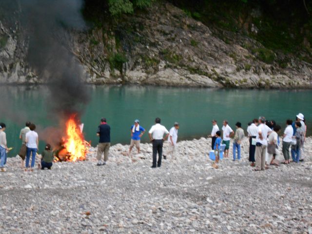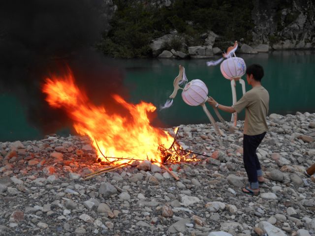 船は一度、川に流し・・・すぐに引き上げ燃やします(私の少年時代は、そのまま川に流し、やがては海に出て西方浄土まで)