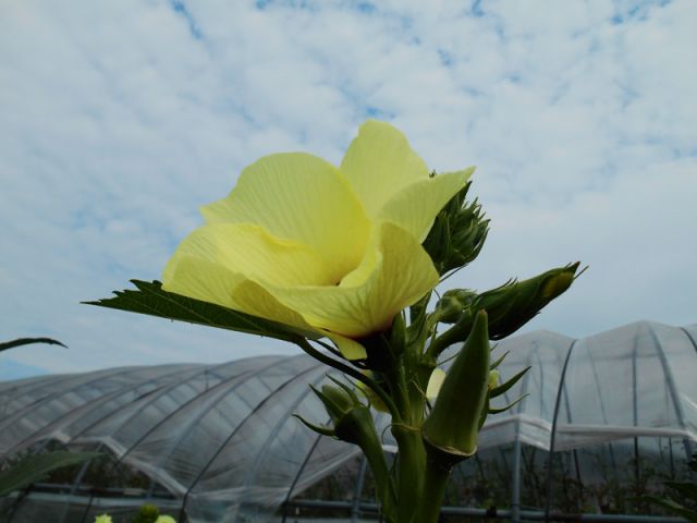 オクラの花が咲きハイビスカスの様です。もう収穫近し