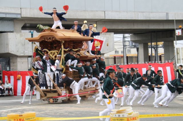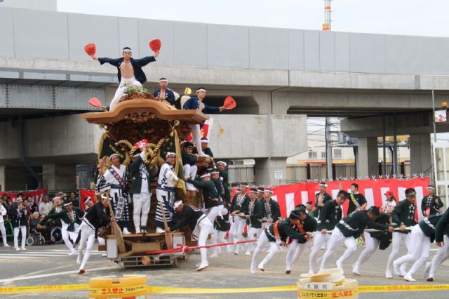 13時から東岸和田駅周辺で曳行、だんじりが直角に回るやりまわりを各町が披露。