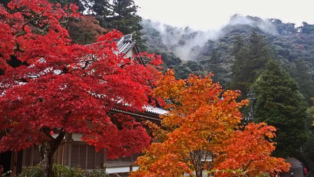雨があがり昼が済んで少し歩く。瀧安寺の紅葉と裏山のガスっているのが画になる