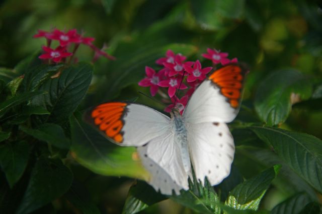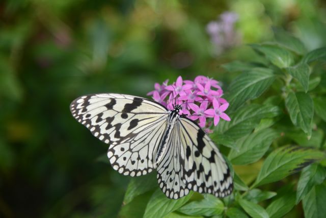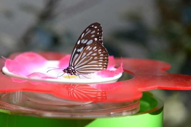 温室とガラス越しの太陽で暖かく蝶が舞い頭にも止まっていた。カメラのレンズが