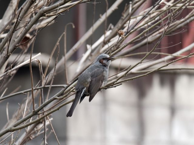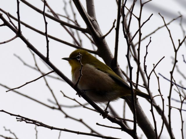 前回メジロがいた場所近くを通ると目の前に変わった鳴き声がする鳥が木にとまっていました。逆光でよくわからいままシャッターを押して撮ったらメジロだった。
