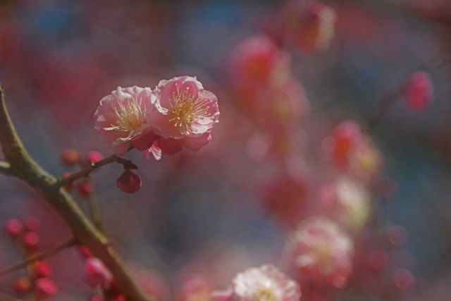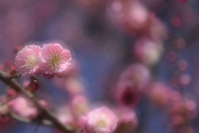 昨年の写真ですが梅を多重露出で撮ったのがあります。2回シャッターを切ります。1回目はピントを合わせ2度目はピントをズラス。暇~人さんのカメラにも多重露出機能があると思います