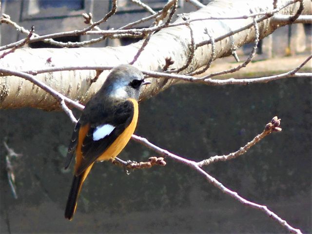 ジョウビタキ ♂ 白いヘルメットと羽の紋が特徴です。