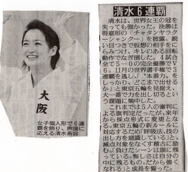 女子形で市鹿野が生んだ東京オリンピック候補、清水希容(ミキハウス)が6連覇しました。
