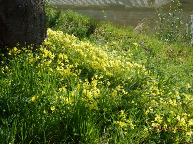 竜田川岸の桜の根元に、一面黄色い絨毯が広がっていました。