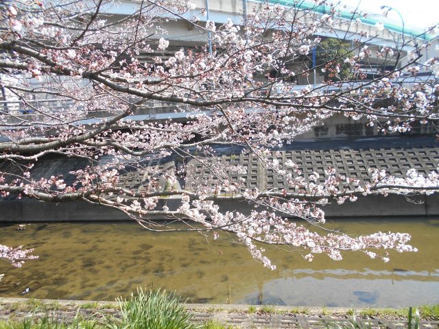毎年、ここのサクラを見ていますが、川面に近い枝から開花しているような気がします。