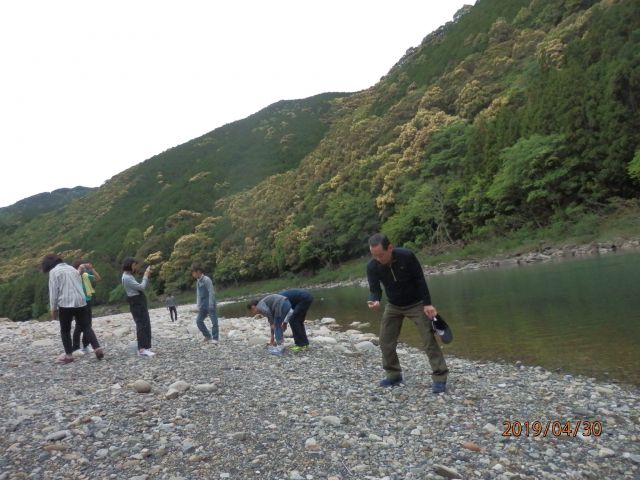 食後は日置川で石投げ・・・向こう岸まで届かない 肩が痛い