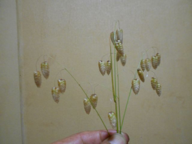 イネ科の植物なので、小花をたくさんつけた小穂ができ、それが細い柄につり下がっています。