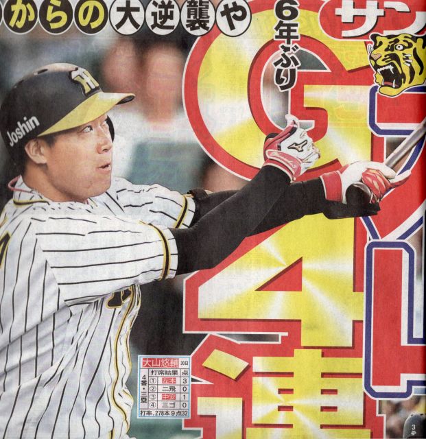 前日の延長12回、高山の劇的サヨナラ満塁ホームランに続き、昨夜は4番大山の先制3ランホームラン・・・・出来すぎだね