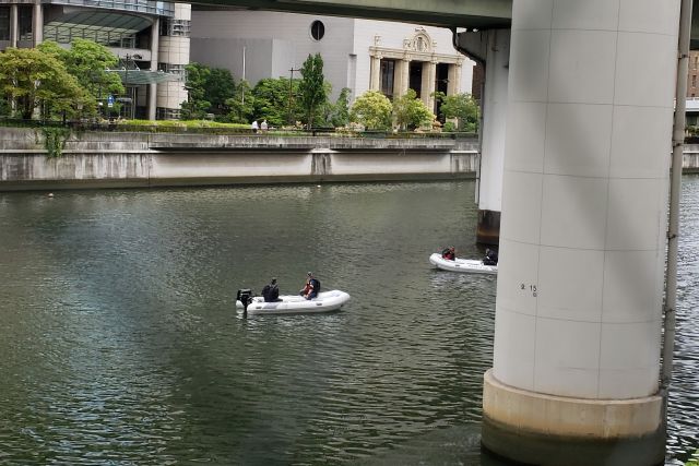 堂島川も、ポリスボートで警戒中