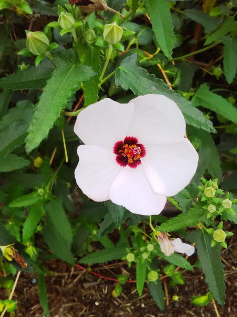 別名タカサゴフヨウ(高砂芙蓉)この花の名前の最初の部分、"矢の根"はこの葉っぱの形が矢尻に似ていることからきています。