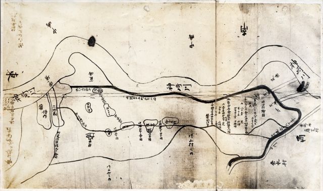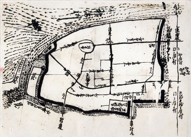 地図をよく見ると黒い縁取りがあり川と同じ模様が描かれており、町は環濠集落(周囲に濠をめぐらした集落)で一カ所が切れており関所があったことが見てとれます。