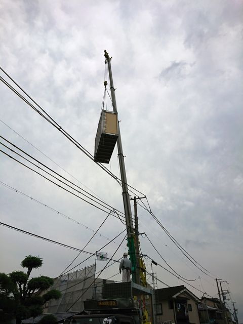 《 電線に当たらないようクレーンを操作、プロの仕事ですね 》