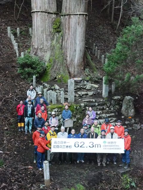 平成29年11月28日、大悲山国有林(京都市左京区)において現地見学会を開催し、峰定寺の御神木である花脊の三本杉のうちの一本が樹高62.3mであることを公表しました。 この樹高は、測定器具を用いて測った樹木において、現存する日本一となります。