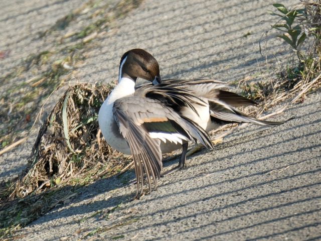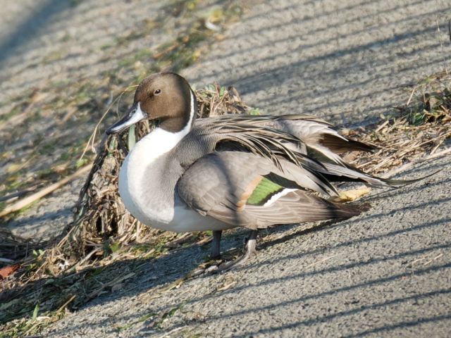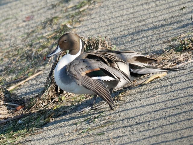 鴨が陸に上がり綺麗な葉羽を毛づくろいしていたのでパチリ。