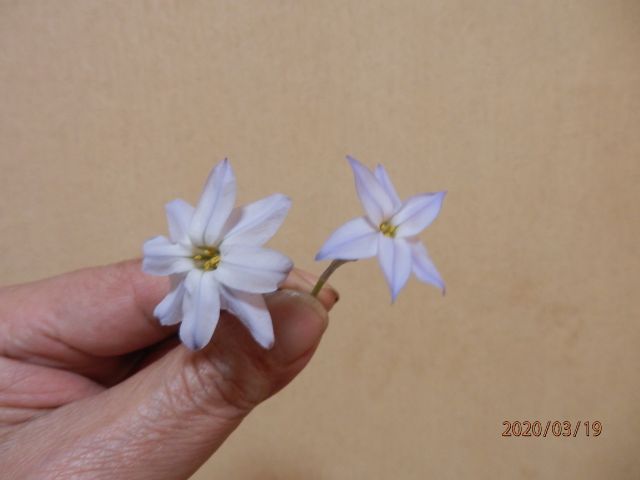 左側:私の発見した、このハナニラは4弁のはなびらが上下に重なり8弁になっています。世紀の大発見かな 暇人さん探してみて下さい!!!