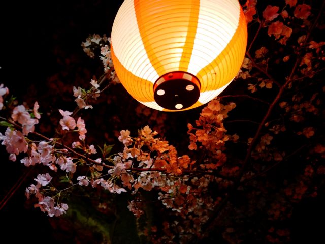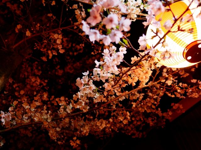 提灯が明るすぎてサクラが提灯の色に染められてしまっている。