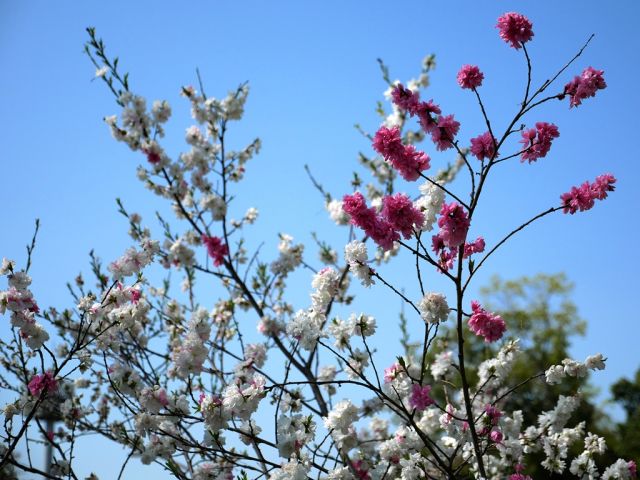 一本の木に赤の花、白の花が咲いています。こんな桜見たのは初めて珍しいですね!