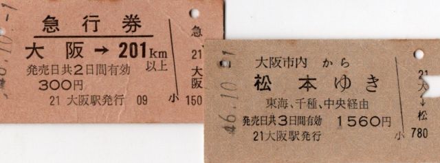 大阪 → 松本 乗車券 1560円 現在 6380円