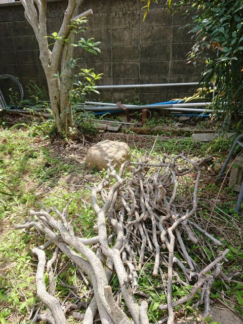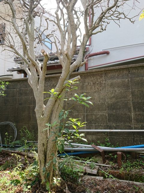 去年の夏に枯れたキンモクセイ、もうダメかなと思っていましたが新しい命が育っています。成長の邪魔にならないように枯れた枝を切っています。