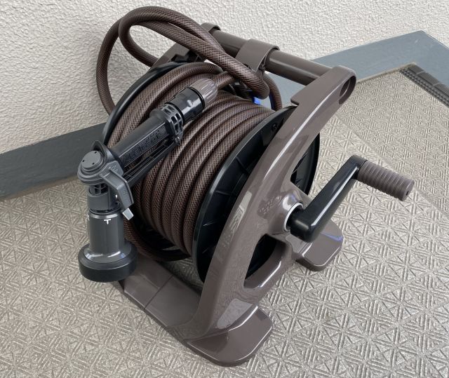 暇~人、水運びは大変ですね、共同給水場所まで15mくらいです10リットルのじょうろ、爺には重すぎます。ホースリール導入です。