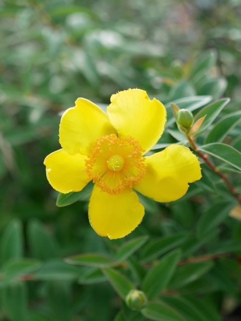 散歩道に咲いていた綺麗な黄色い花一輪と紅い色した蕾か花になるのかよくわからない。