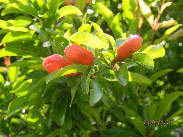 昨日の暇人の投稿した赤い花、もしやザクロ(柘榴)ではないかと散歩道にあるザクロを撮影してきました。実がなればわかると思います。