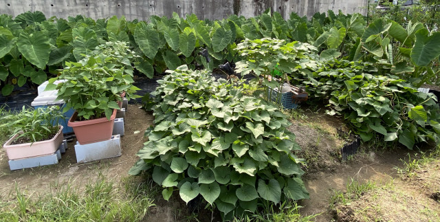 野菜達の姿です。後方はプロのお百姓さん、200本の里芋畑です。