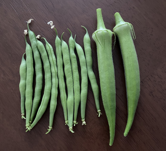 おくらの初収穫です。これは丸オクラ、切口断面が五角形ではありません。これくらい大きくなっても堅くないのが特徴らしいです。