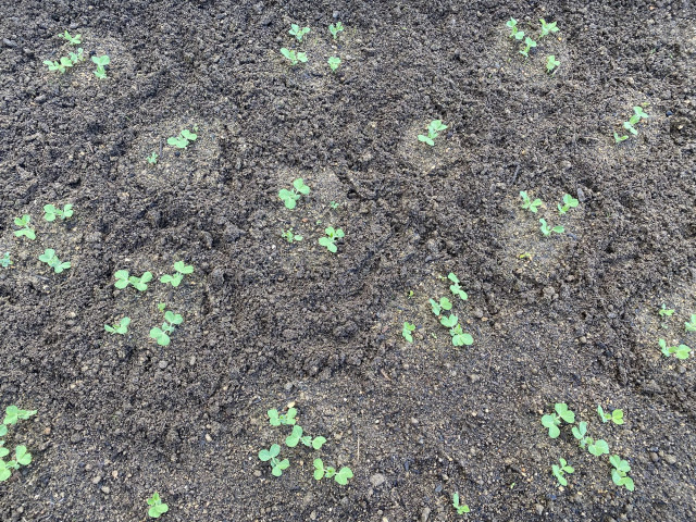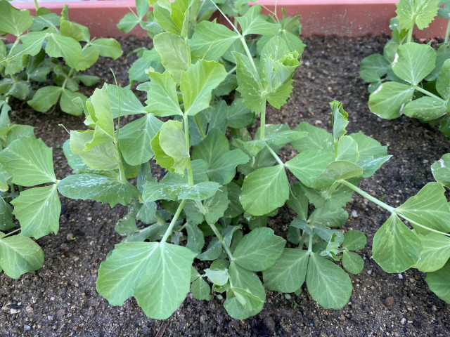 家庭菜園、なんとか育ってくれています!エンドウ豆は双葉が出てきました。