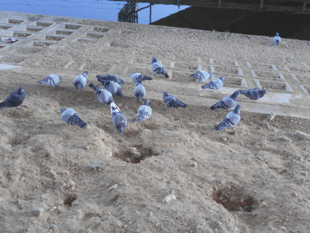 鳩が集団で地面を つついています。あなぼこが出来ています。