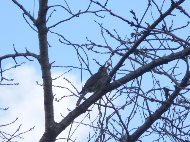 これはヒヨドリかな・・・逆光で見にくかった。なにか大きな物をくわえていました。