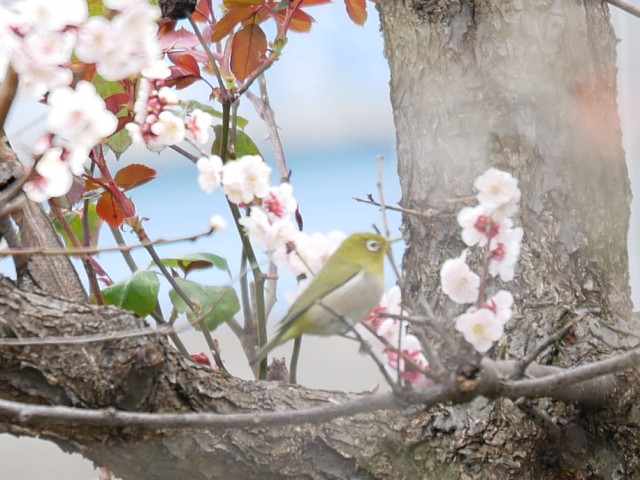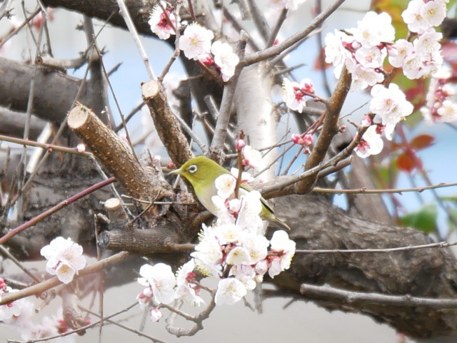 買い物から帰ったら梅の木にメジロが遊びに来ていました。