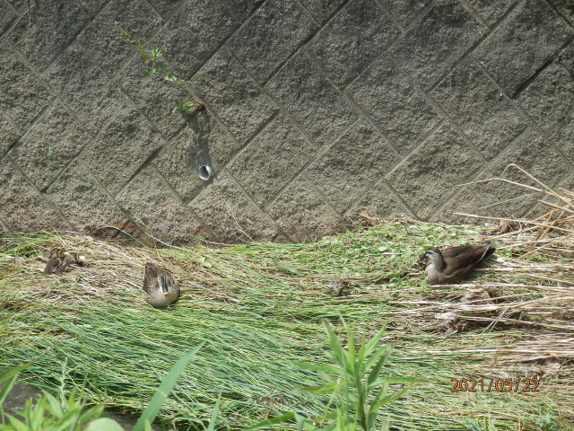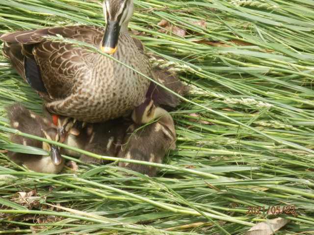 普段、カルガモは母親だけで子育てをします。しかし、緊急事態が発生すると父親も寄り添います。 移動先に少し距離をおいてヒナ達を見守るような行動をしてました。こんなの初めて見ました。(右端が父親)