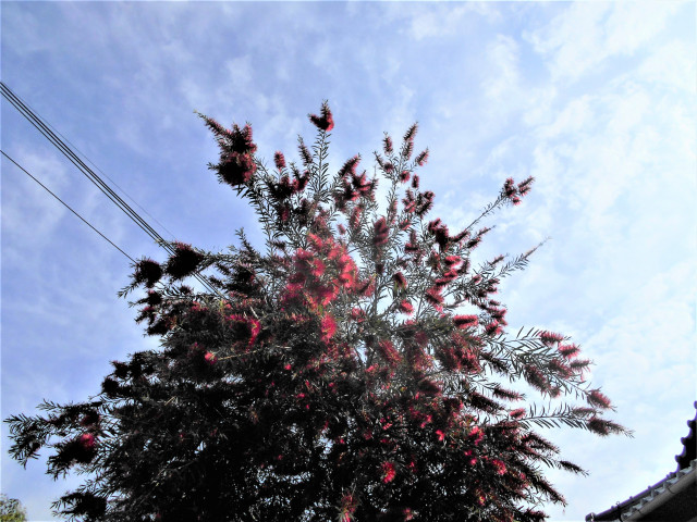 青空に真っ赤な花が映えています。花の形がブラシになっています。