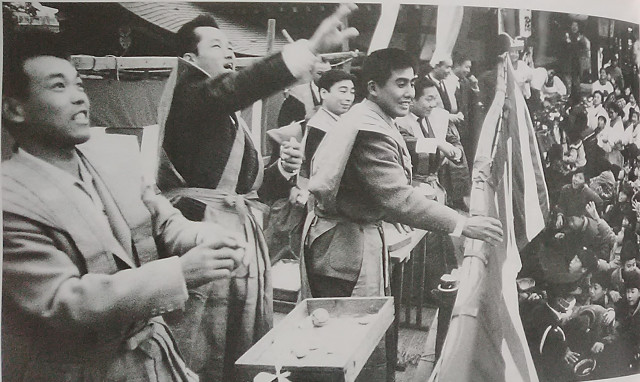 吹田駅の近くにある泉殿宮であつたイベントの写真で、写真のコメントには「泉殿宮、節分の豆撒きに著名人 阪神タイガース、村山や並木、芸能人の茶川一郎が豆を撒く。」