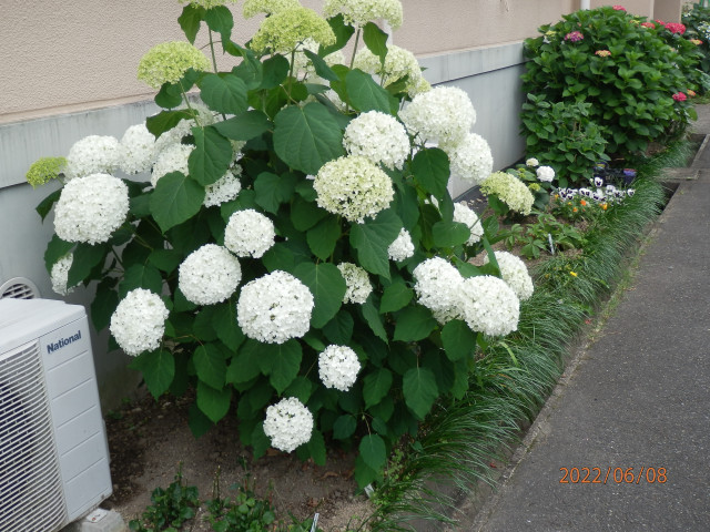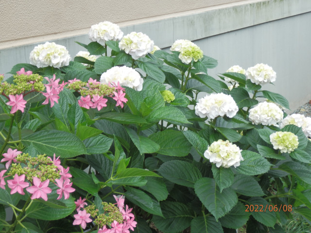 左下はピンクのガクアジサイ。右は白アジサイです。
