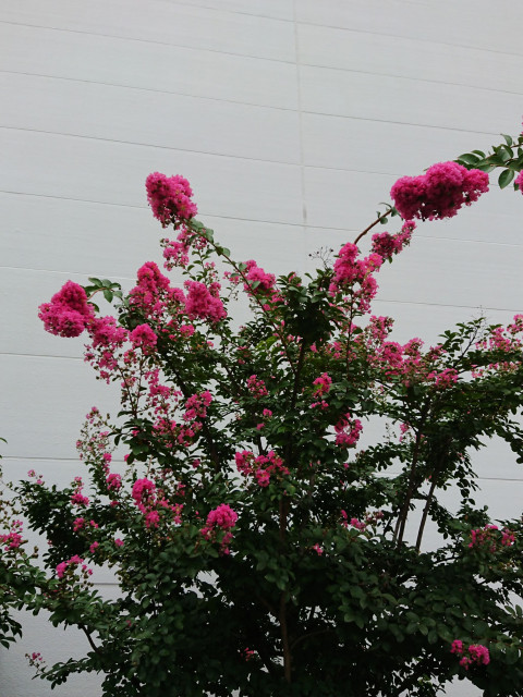 百日紅はよく見かけるのはピンク色した花ですが、きょう散歩道で見つけた百日紅は白色や紅色の花が咲いていました。