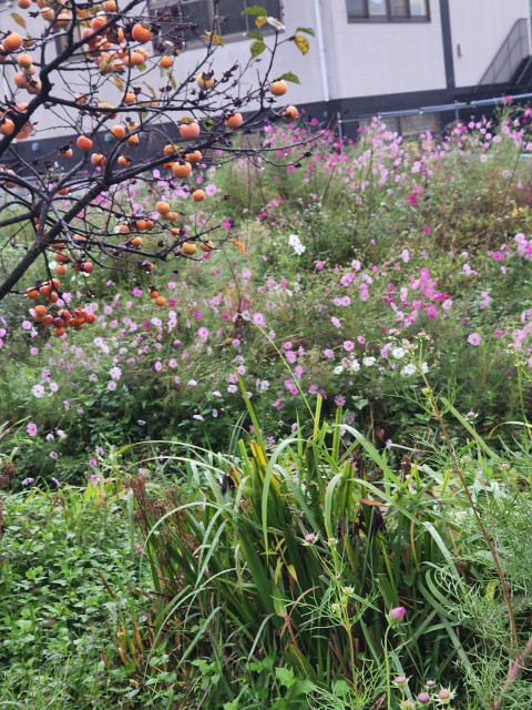 【柿とコスモス畑】