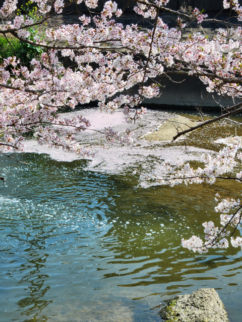 風が吹くたび、サクラの花びらが風に舞い・・・川面に落ちています。