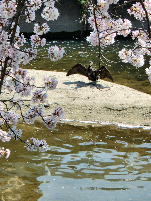 散り始めた桜の樹の下で川鵜が羽を乾かしています。