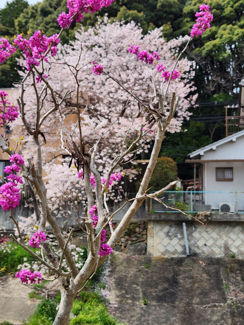 花蘇芳(はなずおう) 葉が出る前にピンク色の小さい蝶形の花が固まって咲きます。