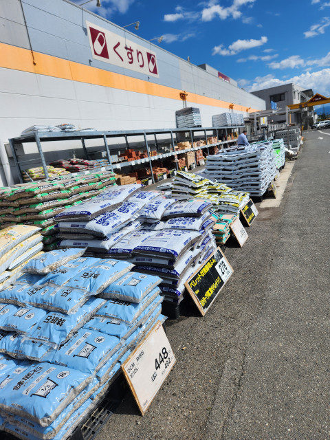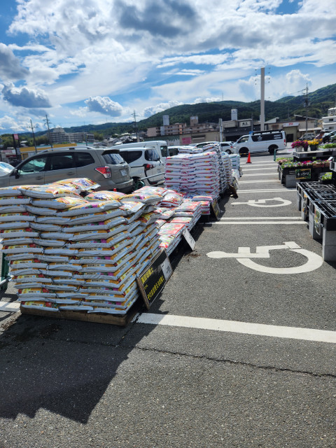 駐車場に はみ出して肥料が山積みされています。牛や鶏の糞肥料、腐葉土や他にも色々ありますね。案外安い・・・
