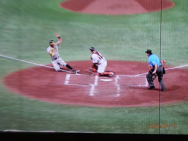 4回表、近本中安打 佐藤輝が粘って四球 そして2アウト1・3塁で、今日5番の大山がレフト線ギリギリの2塁打